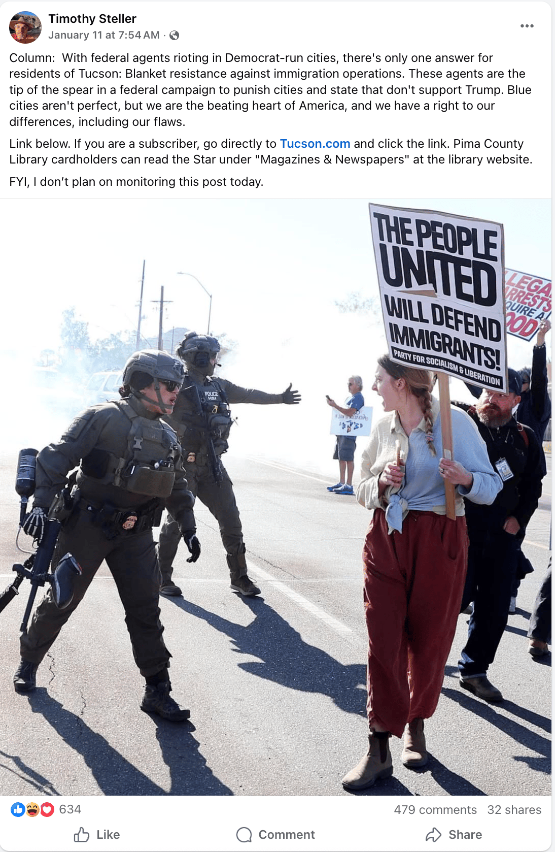 Steller is being brave enough to write boldly about the outrage that he and other Tucsonans are legitimately feeling over the prospect of masked goons descending on their town.