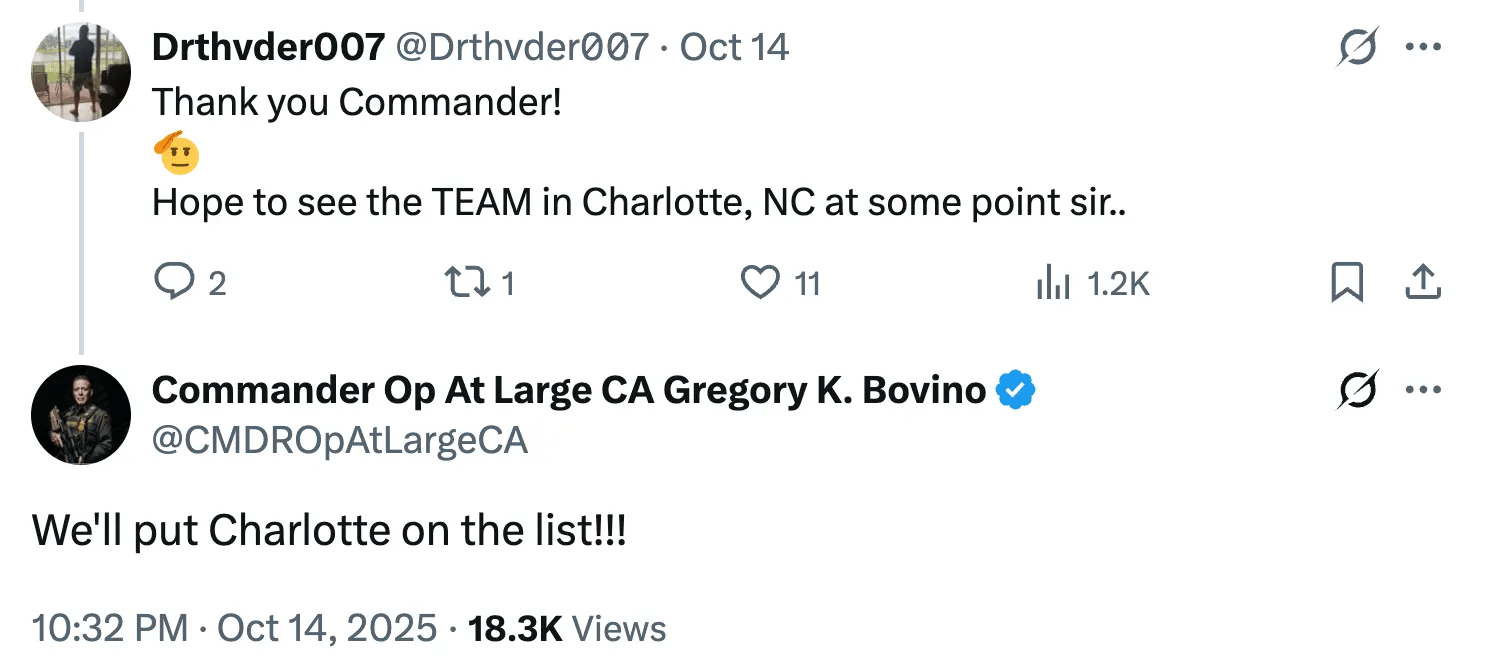 In the case of Charlotte, it appears Bovino decided to go there after somebody tweeted at him.